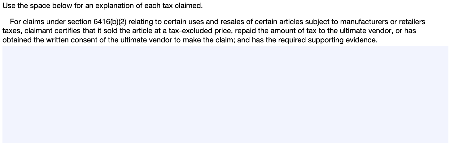Schedule 6 (Form 8849) is an attachment to Form 8849, which is used to claim certain fuel-related refunds or credits. While Form 8849 focuses primarily on specific claims, Schedule 6 serves as a catch-all section for other claims not covered elsewhere on the form. It allows taxpayers to seek refunds or credits for various taxes, such as federal excise taxes, customs duties, or certain other taxes or fees.