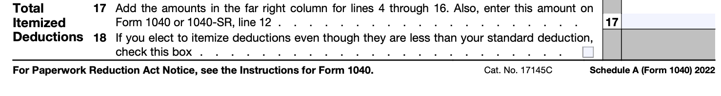 Copy the total from line 18 of Schedule A (Form 1040) to line 12a of Form 1040. This is the total amount of your itemized deductions.