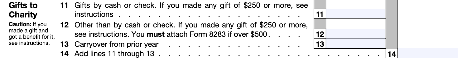 Enter your total cash contributions on line 11, and non-cash contributions on line 12. Add lines 11 and 12, and enter the result on line 13.