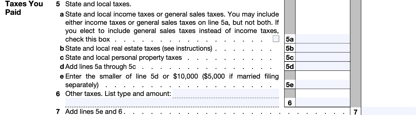 Enter the total state and local income taxes or general sales taxes paid on line 5a, real estate taxes on line 5b, and personal property taxes on line 5c. Add lines 5a, 5b, and 5c, and enter the result on line 5d, subject to the SALT deduction limit ($10,000 or $5,000 if married filing separately).