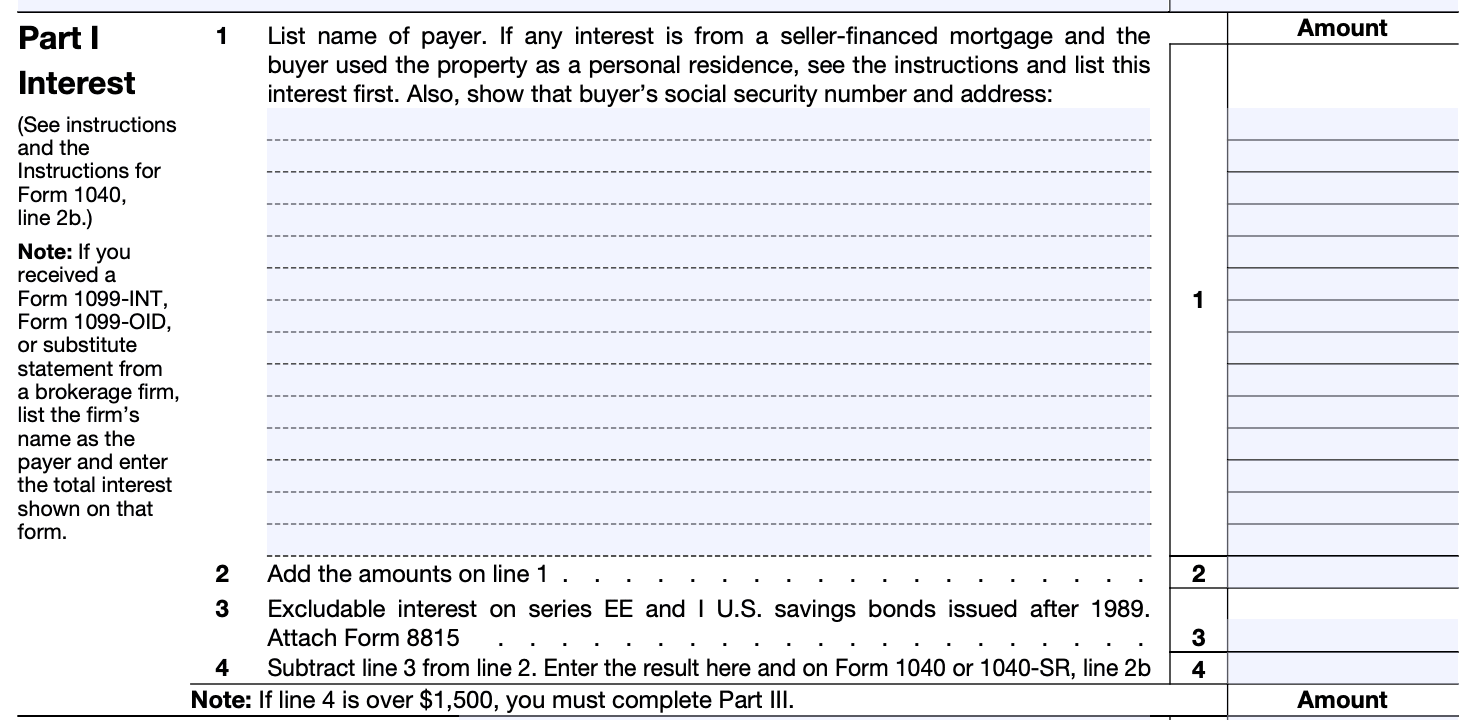 Tax-exempt interest: If you received tax-exempt interest, such as interest from municipal bonds, you still need to report it on Schedule B. However, tax-exempt interest is generally not subject to federal income tax.