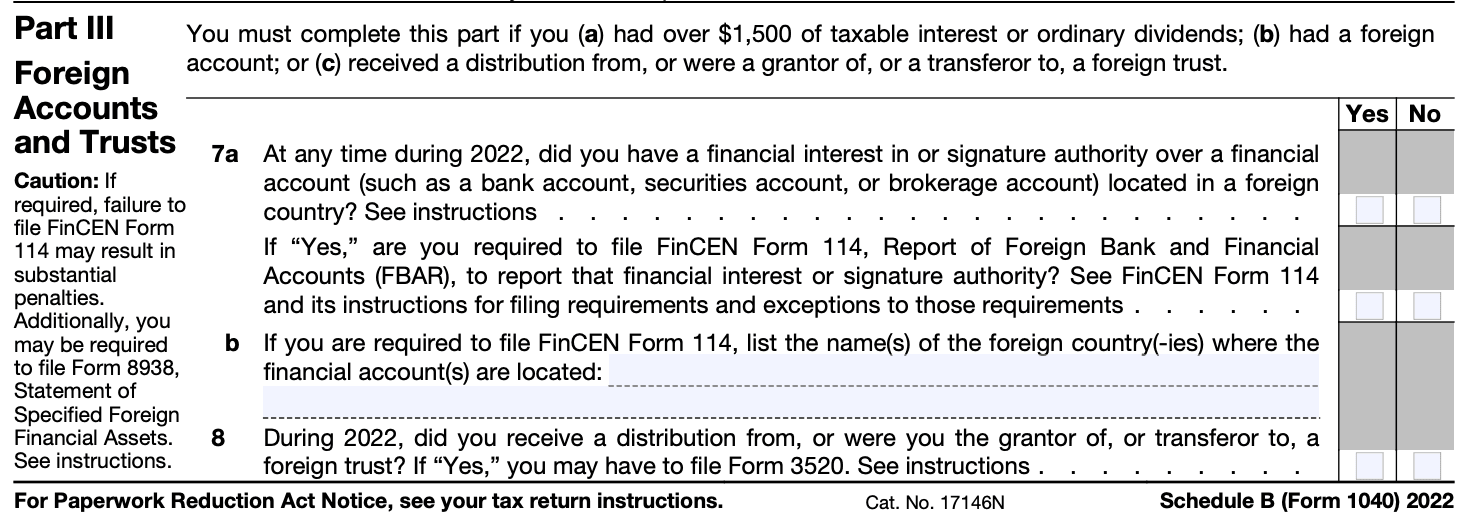 There are a few additional questions on Schedule B that you need to answer. These questions mainly pertain to foreign accounts and income. Carefully read and respond to these questions based on your specific situation.