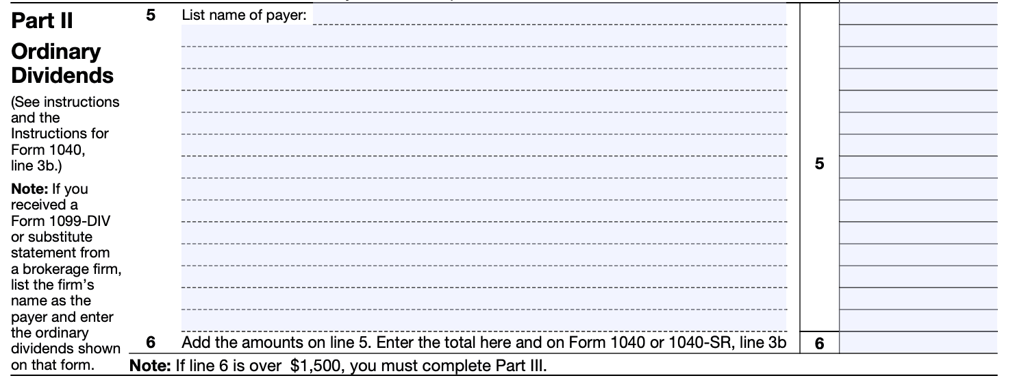 If you received dividend income, you'll need to report it on Part II of Schedule B. Dividends are typically paid by stocks, mutual funds, or other investments. Similar to reporting interest income, you'll need to provide the name of the payer, the amount of dividend income received, and any associated taxes withheld. Add up all your dividend income and enter the total in the designated box.