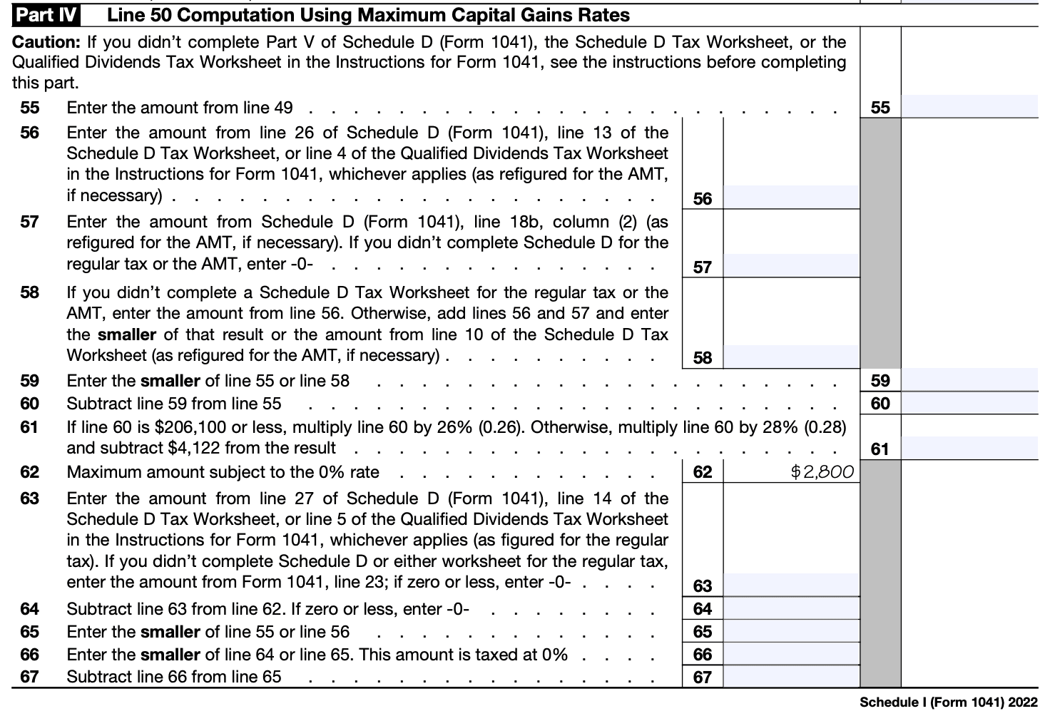 Alternative minimum tax (AMT) calculation: Schedule I includes a section for calculating the Alternative Minimum Tax (AMT) for estates and trusts. The AMT is a separate tax calculation that ensures taxpayers with high deductions and certain types of income still pay a minimum amount of tax. By calculating the AMT, estates and trusts can determine if they owe any additional tax.