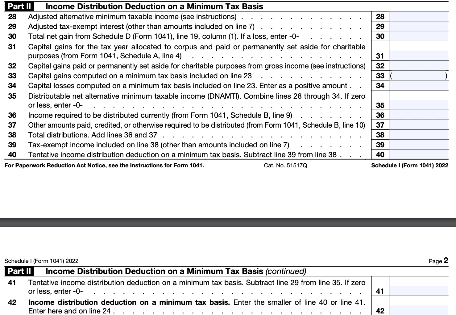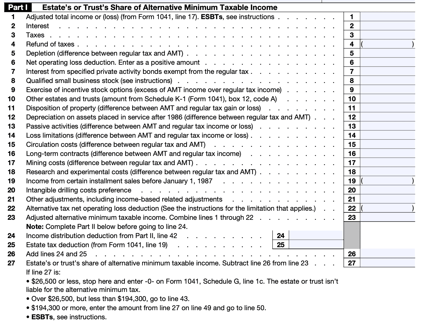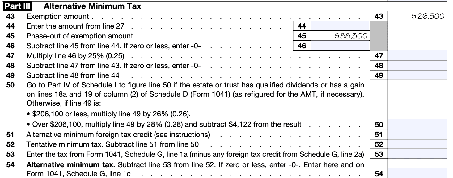 Alternative minimum tax (AMT): Estates and trusts are subject to the alternative minimum tax if their taxable income exceeds certain thresholds. If the estate or trust is subject to AMT, you will need to complete and attach Form 6251, Alternative Minimum Tax—Individuals, to the Form 1041.