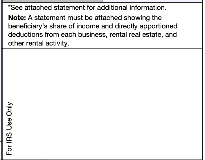 Multiple beneficiaries: If there are multiple beneficiaries, a separate Schedule K-1 must be issued for each beneficiary, indicating their respective share of income, deductions, and credits.
